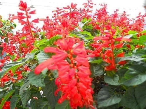 一串紅開出出來花色猩紅,而且花朵又大,數量又多。顯得非常的喜慶。可以在比較歡樂的節日里裝飾一下環境。我們可以用來點綴家居,一串紅是一種矮生植物,我們在家中盆栽種植的時候,可以擺在陽臺以及窗臺。一串紅的花色也是非常的多。有粉白色,紫白色的。多數都是雜交色,這樣我們擺在家中可以使我們家中環境更加的優雅別致。